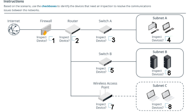 Se reportan los siguientes problemas de red: Subnet B no puede comunicarse con Subnet A. Subnet C no tiene acceso a Internet. Algunos dispositivos en Subnet C no tienen conectividad alguna. ¿Qué dispositivos debes inspeccionar para resolver estos problemas? (Marca todos los que aplican)