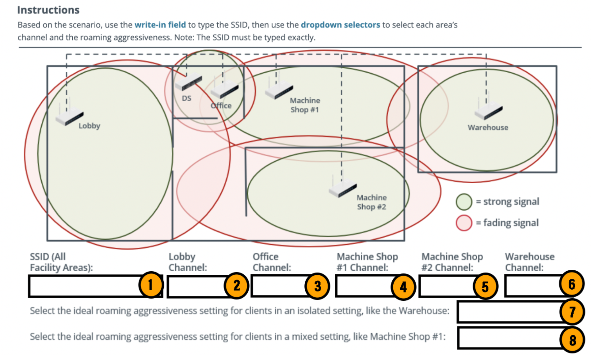 Instrucciones Según el escenario, usa el campo de texto para escribir el SSID, luego usa los selectores desplegables para seleccionar el canal y el nivel de agresividad de roaming de cada área.Nota: El SSID debe escribirse exactamente. 1. SSID (All Facility Areas): 2. Lobby (elige entre: 1, 3, 5): 3. Office (elige entre: 1, 6, 11): 4. Machine Shop #1 Channel (elige entre: 3, 5, 6): 5. Machine Shop #2 Channel (elige entre 4, 11, 5: 6. Warehouse Channel (elige entre: 11, 8, 3): 7. Machine Shop #1 – Roaming aggressiveness (High, Medium o Low): 8. Warehouse – Roaming aggressiveness (High, Medium o Low):