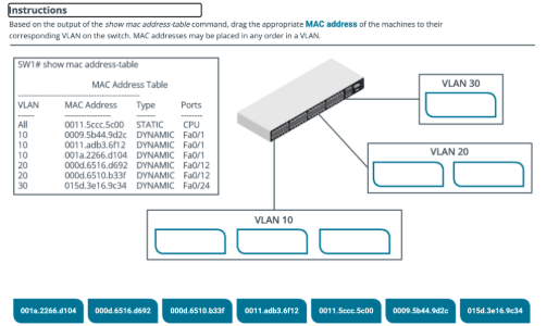Eres un ingeniero de campo de redes configurando un sitio remoto para reflejar la oficina corporativa con fines de respaldo (failover). Debes configurar tu switch lógica y físicamente para replicar las Redes de Área Local Virtuales (VLANs). Desafortunadamente, no puedes usar el archivo de configuración porque alguien lo borró accidentalmente. Sin embargo, debido a la política de la empresa, anotaste la Tabla de Direcciones MAC en una ubicación separada en caso de una situación como esta.